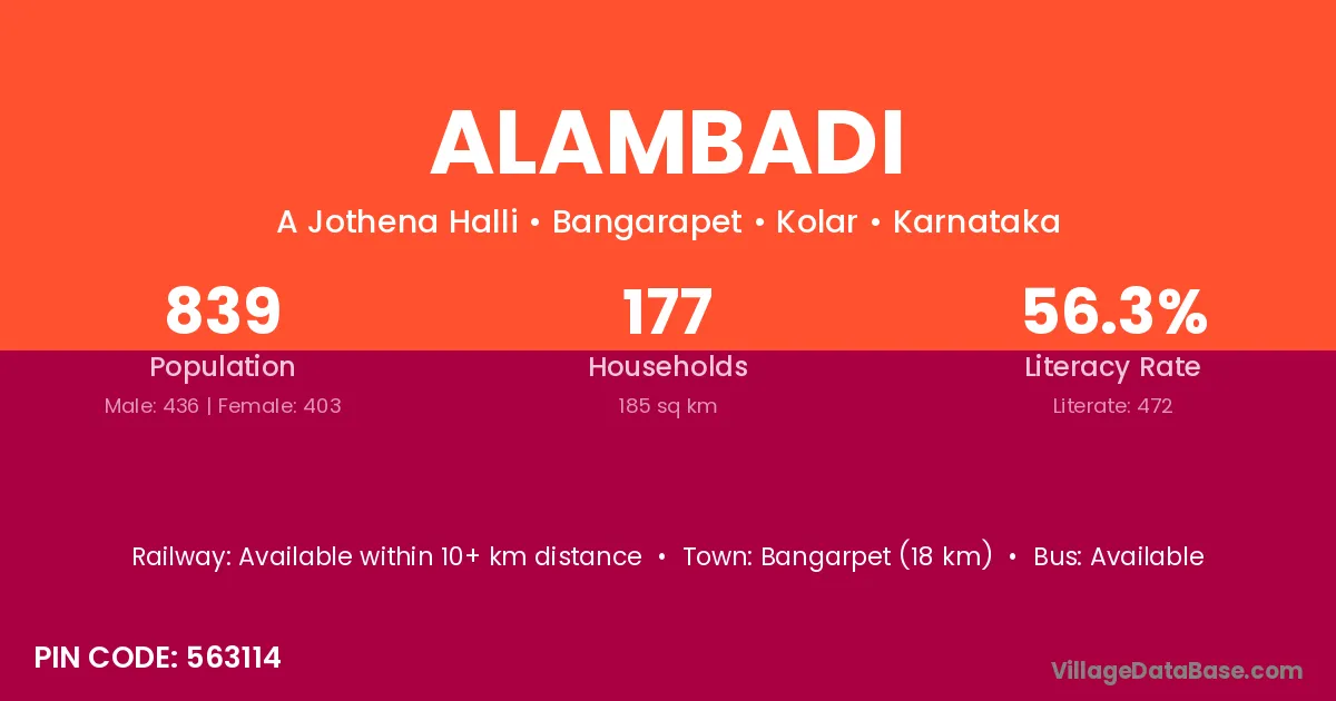 The literacy rate of Alambadi village is 53.41%. Male literacy stands at 61.96% and female literacy at 44.96%.