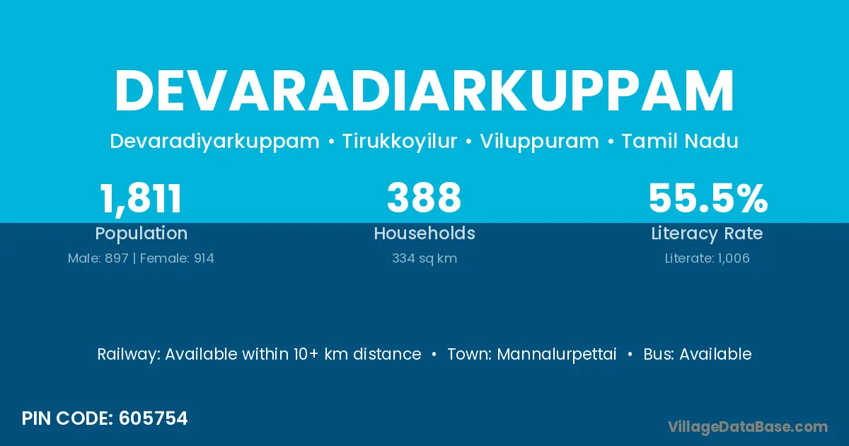 Devaradiarkuppam village has a total population of 1,811 people, of which 897 are males and 914 are females.