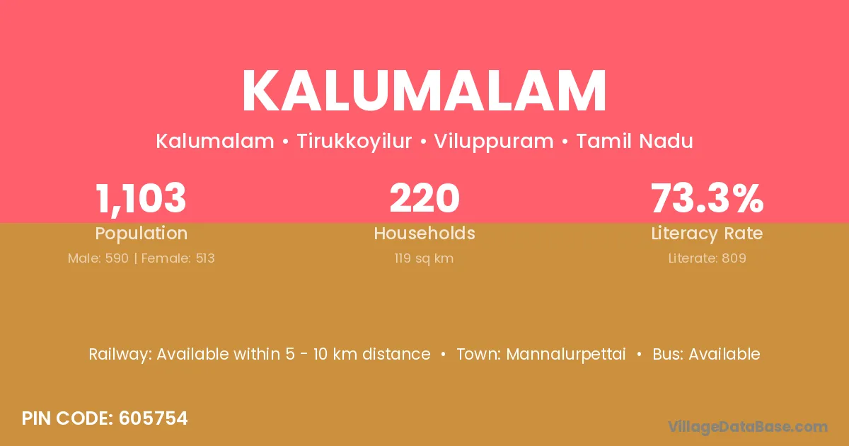 Kalumalam village has a total population of 1,103 people, of which 590 are males and 513 are females.