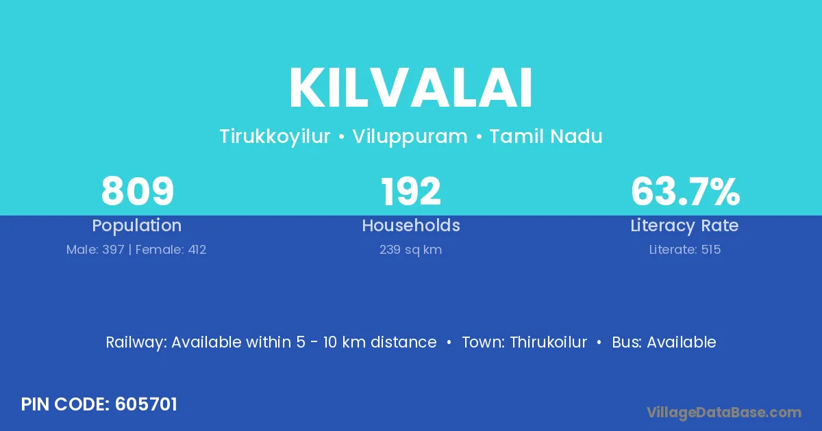 Thirukoilur is the nearest town to Kilvalai village for major economic activities