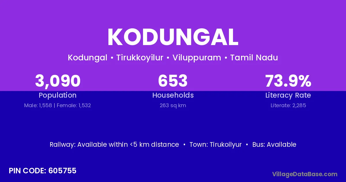 Tirukoilyur is the nearest town to Kodungal village for major economic activities