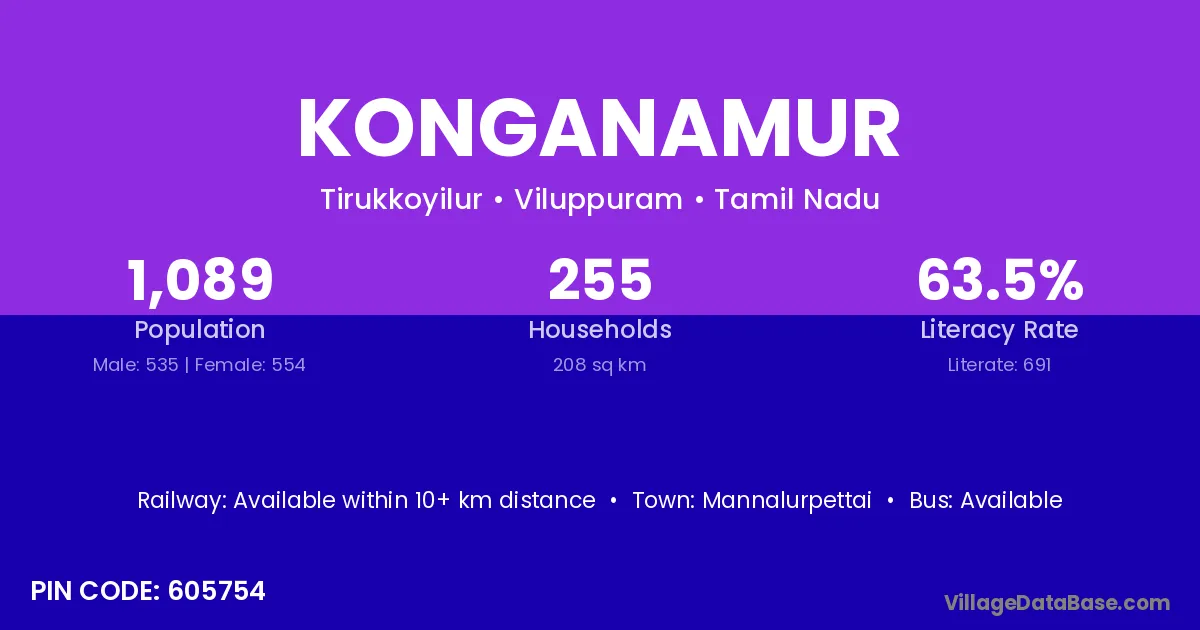 Konganamur village has a total population of 1,089 people, of which 535 are males and 554 are females.