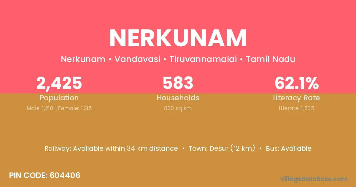 Nerkunam village has a total population of 1,239 people, of which 616 are males and 623 are females.