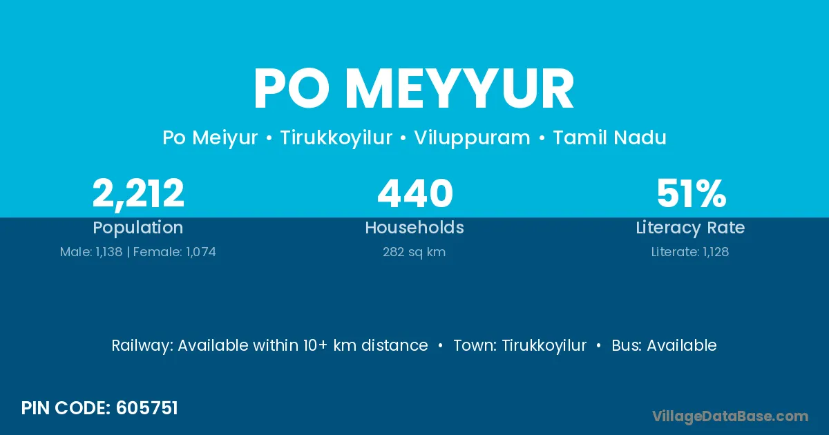 Po Meyyur village has a total population of 2,212 people, of which 1,138 are males and 1,074 are females.