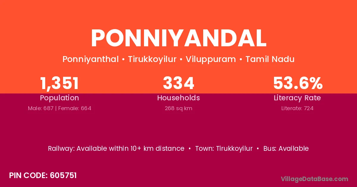 Ponniyandal village has a total population of 1,351 people, of which 687 are males and 664 are females.