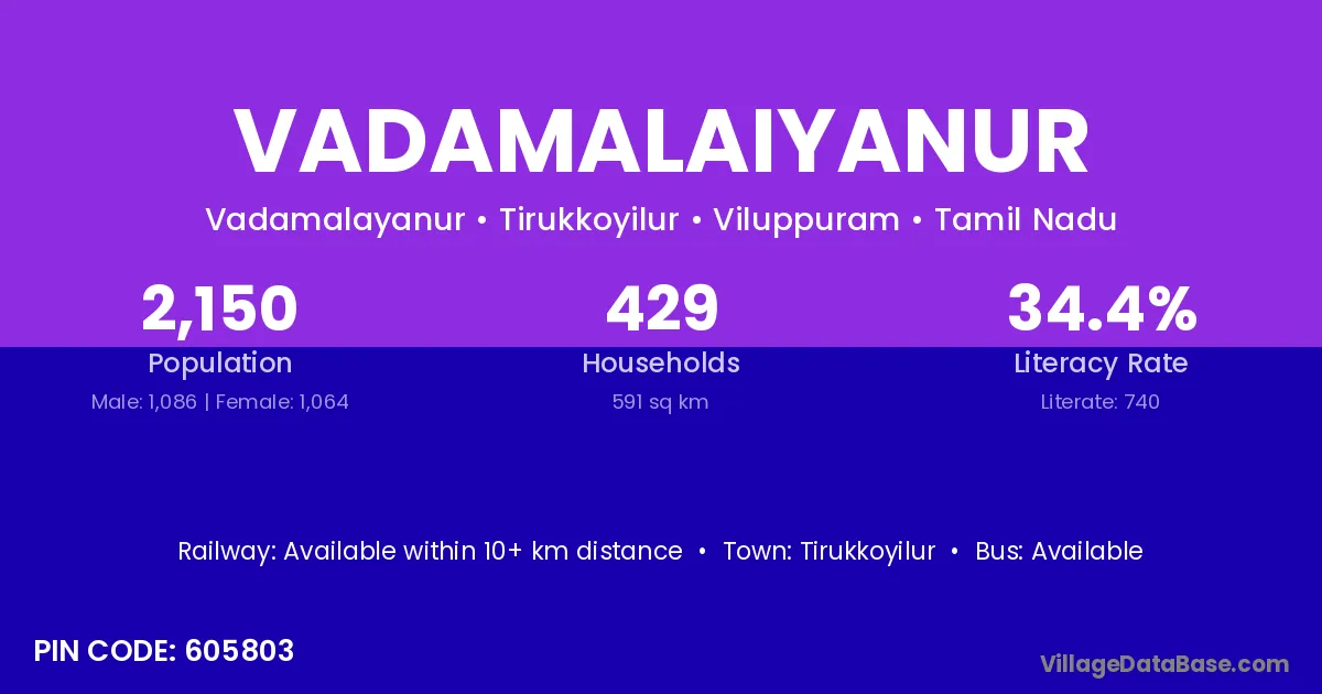 Tirukkoyilur is the nearest town to Vadamalaiyanur village for major economic activities
