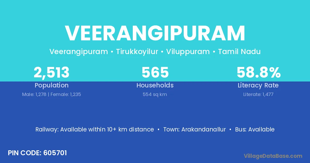 Veerangipuram village has a total population of 2,513 people, of which 1,278 are males and 1,235 are females.