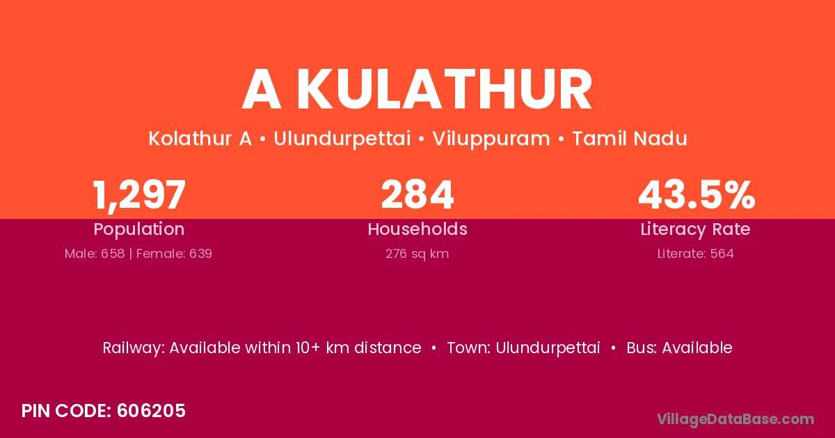 Ulundurpettai is the nearest town to A Kulathur village for major economic activities