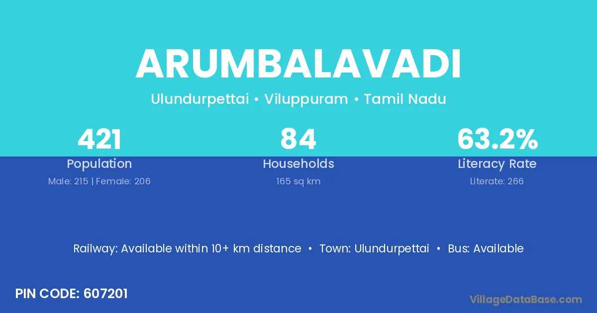 Arumbalavadi village has a total population of 421 people, of which 215 are males and 206 are females.