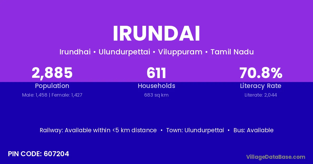 Irundai village has a total population of 2,885 people, of which 1,458 are males and 1,427 are females.
