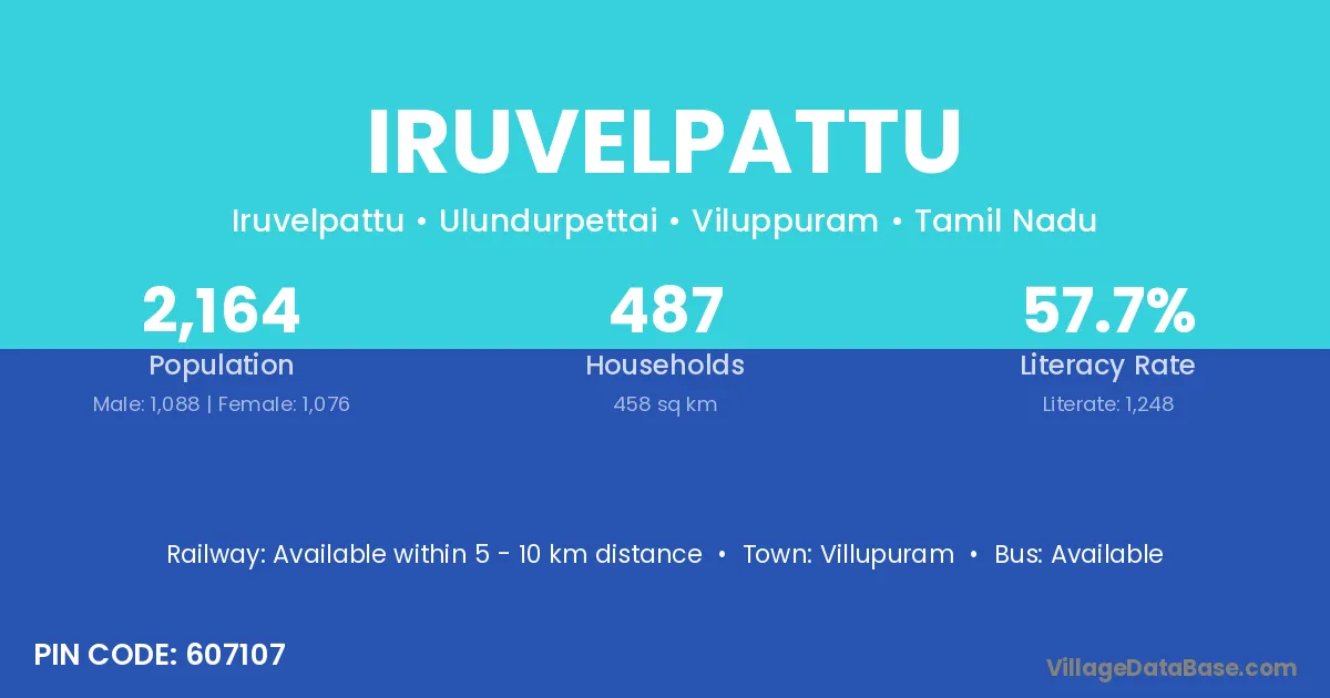 Iruvelpattu village has a total population of 2,164 people, of which 1,088 are males and 1,076 are females.
