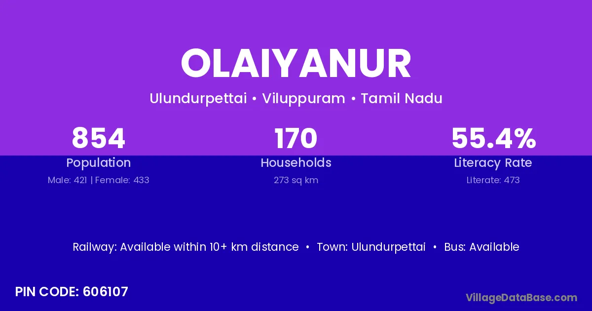 Ulundurpettai is the nearest town to Olaiyanur village for major economic activities
