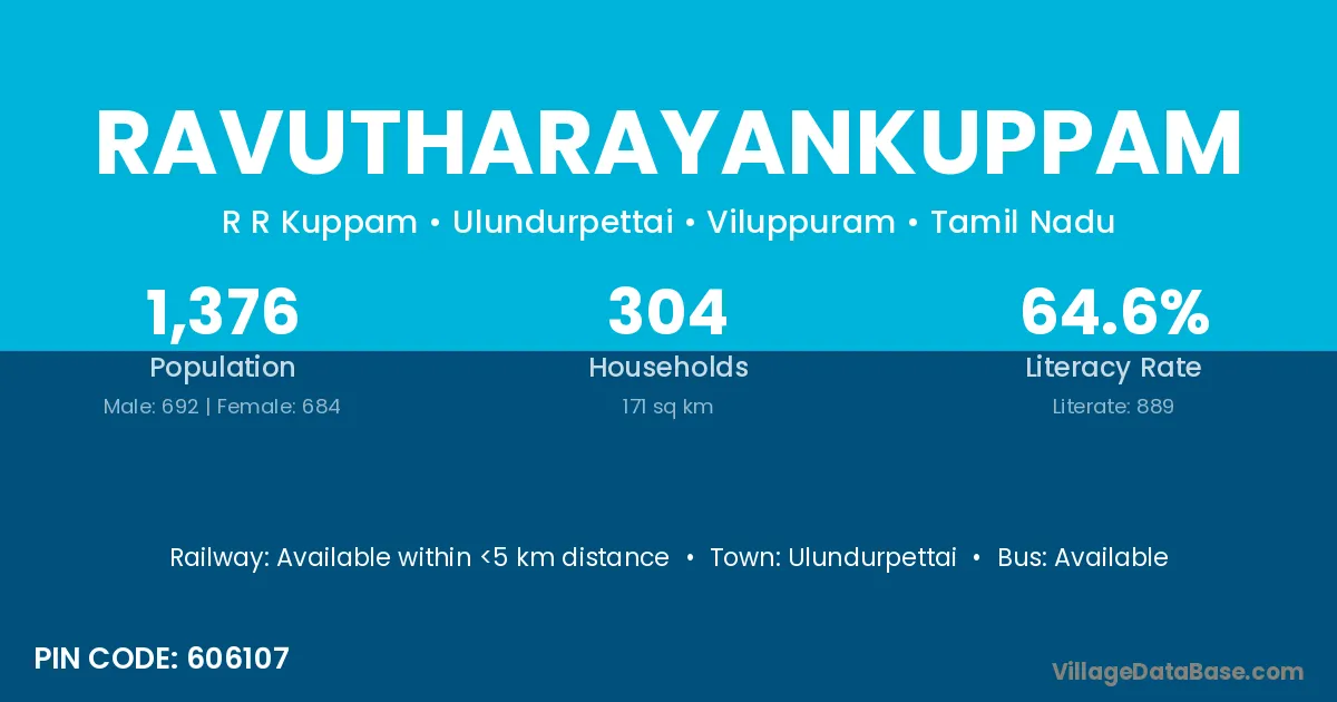 Ravutharayankuppam village has a total population of 1,376 people, of which 692 are males and 684 are females.