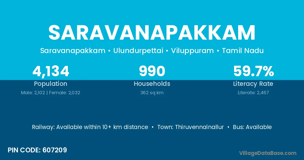 Saravanapakkam village has a total population of 4,134 people, of which 2,102 are males and 2,032 are females.
