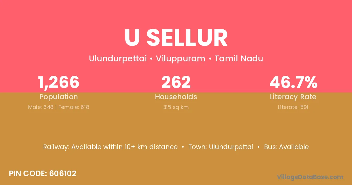 U Sellur village has a total population of 1,266 people, of which 648 are males and 618 are females.
