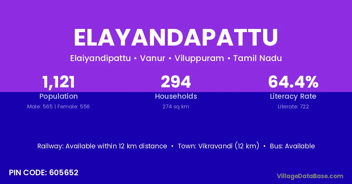 Vikravandi (12 km) is the nearest town to Elayandapattu village for major economic activities and is located approximately 12 km away.