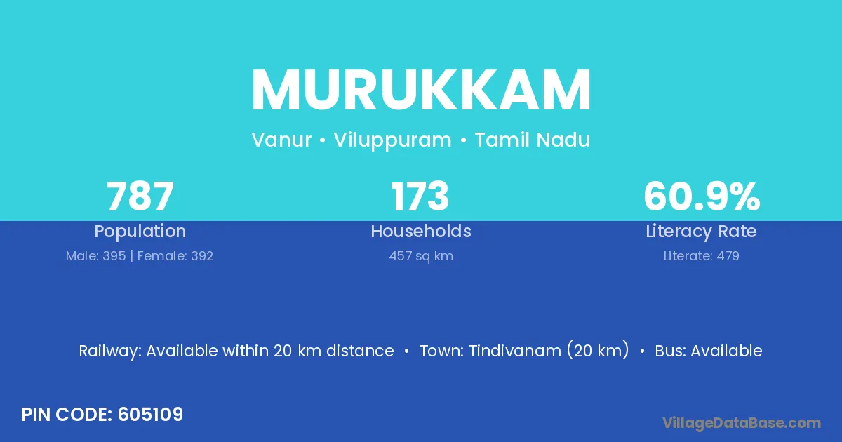 Tindivanam (20 km) is the nearest town to Murukkam village for major economic activities and is located approximately 20 km away.