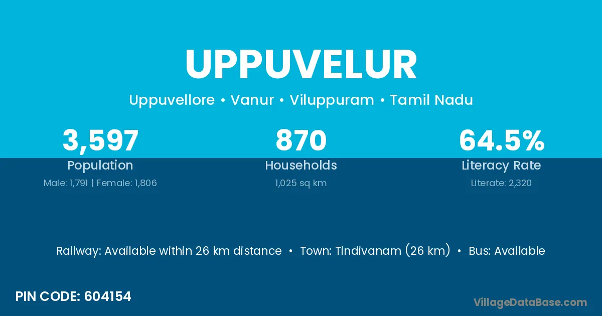 Tindivanam (26 km) is the nearest town to Uppuvelur village for major economic activities and is located approximately 26 km away.