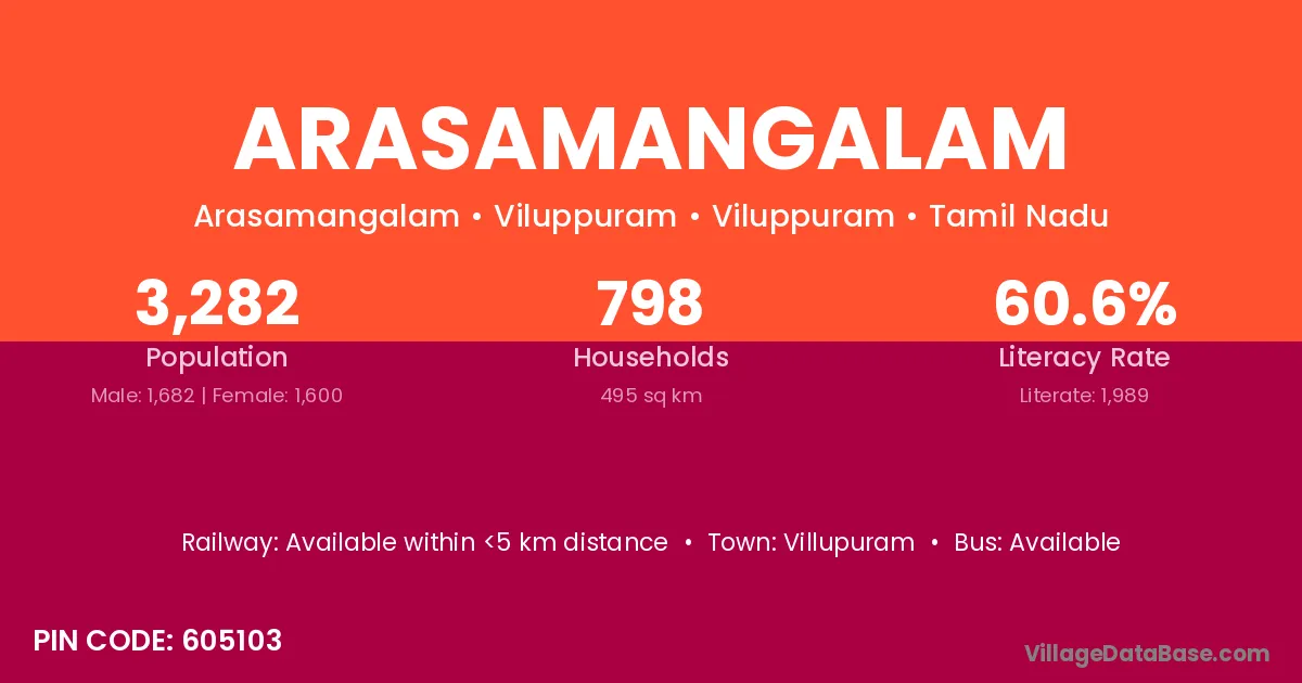 According to Census 2011 information, the village code of Arasamangalam village is 605103.