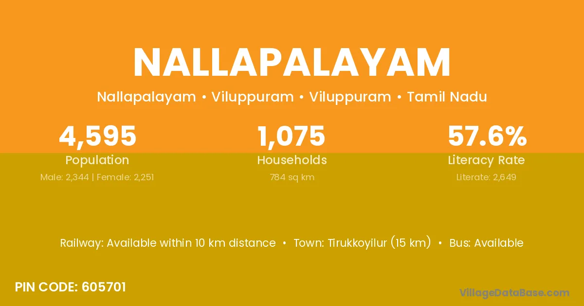 Tirukkoyilur (15 km) is the nearest town to Nallapalayam village for major economic activities and is located approximately 15 km away.