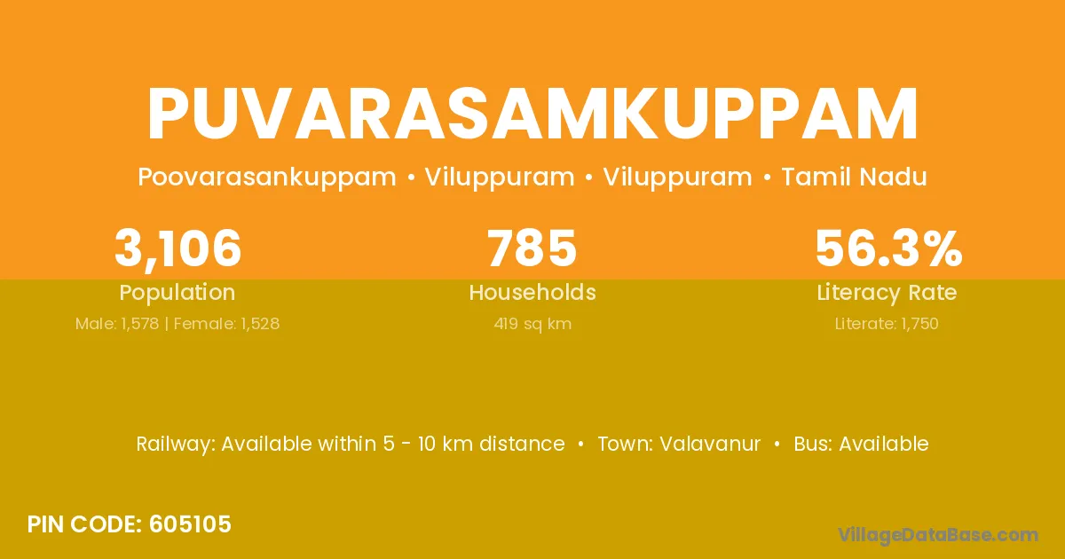 Puvarasamkuppam village has a total population of 3,106 people, of which 1,578 are males and 1,528 are females.