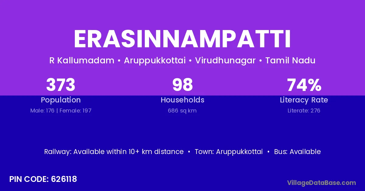 According to Census 2011 information, the village code of Erasinnampatti village is 626118.