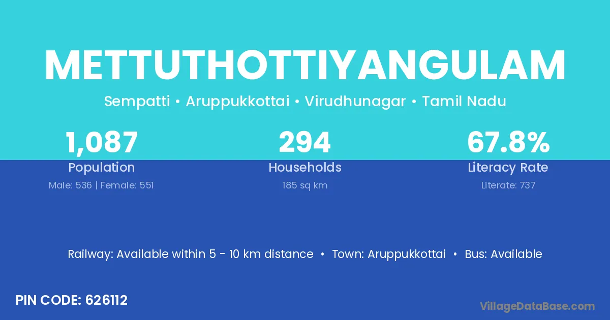 Aruppukkottai is the nearest town to Mettuthottiyangulam village for major economic activities