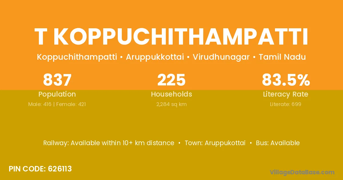Aruppukottai is the nearest town to T Koppuchithampatti village for major economic activities