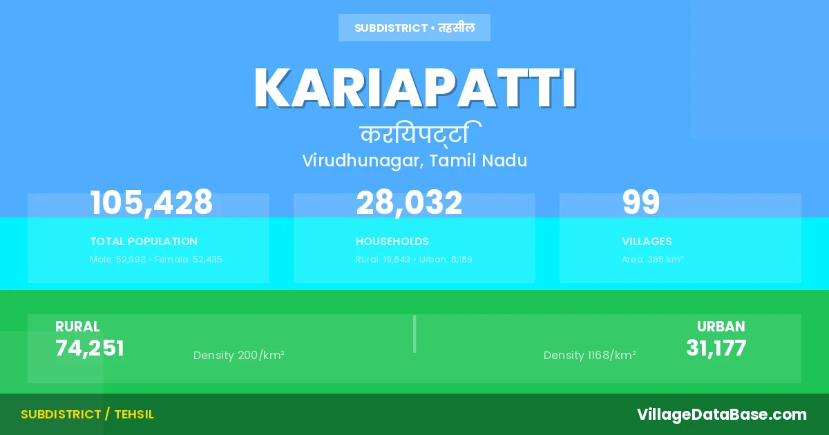 According to the 2011 census The total area of Kariapatti Taluka is 398 km², with a population of 105428 people. The population density is 265 inhabitants per square kilometre, and there are approximately 28032 houses in the sub district.
