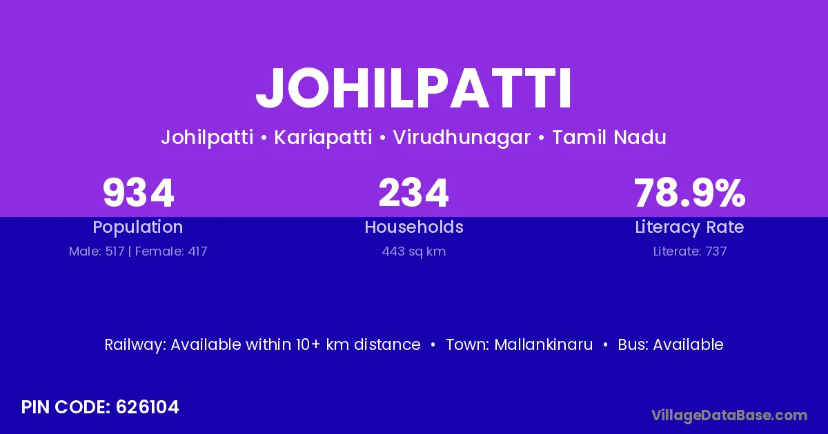 According to Census 2011 information, the village code of Johilpatti village is 626104.