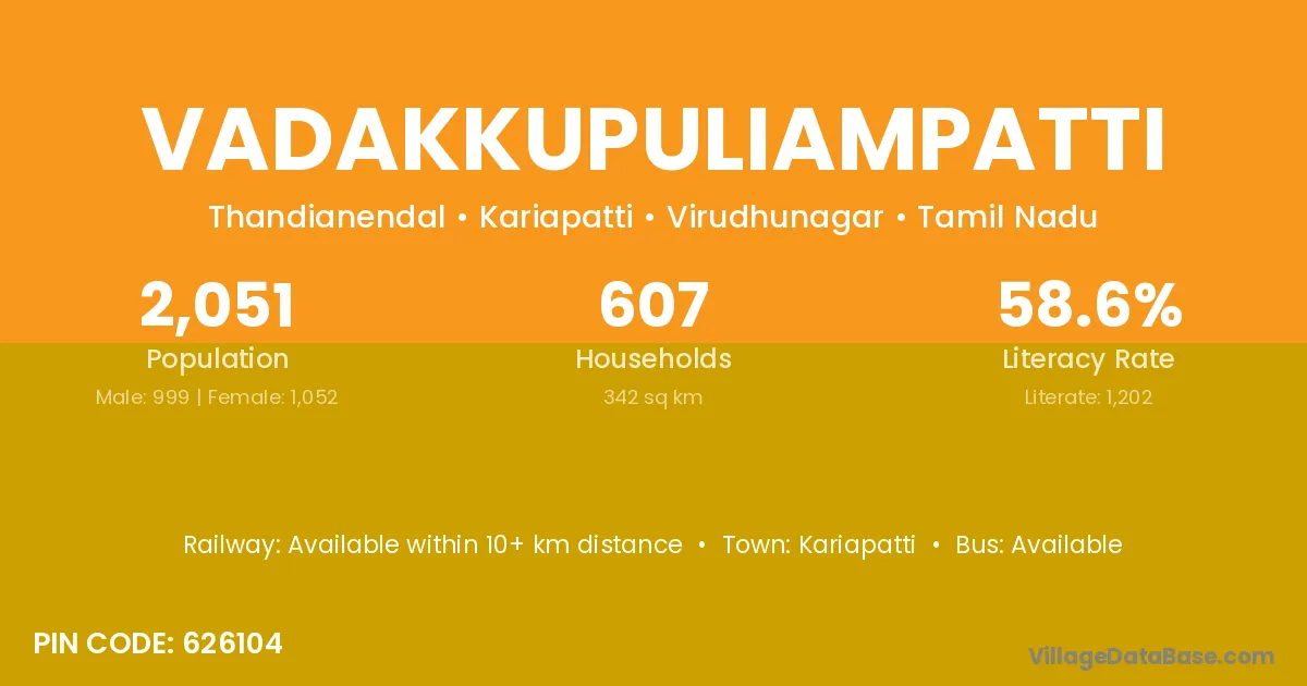 Vadakkupuliampatti village has a total population of 2,051 people, of which 999 are males and 1,052 are females.