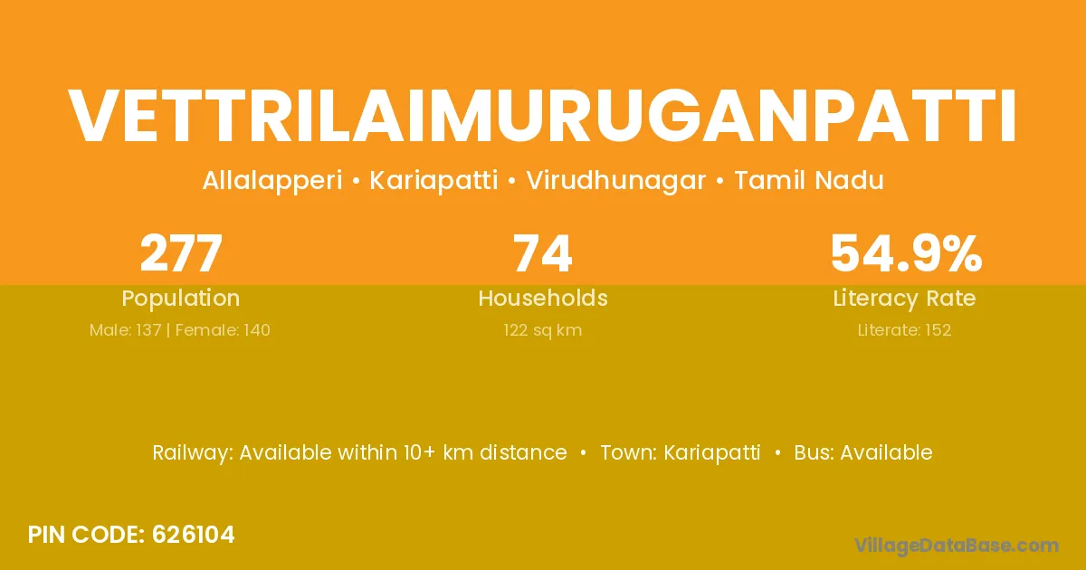 Vettrilaimuruganpatti village has a total population of 277 people, of which 137 are males and 140 are females.