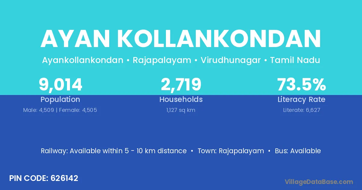 Rajapalayam is the nearest town to Ayan Kollankondan village for major economic activities