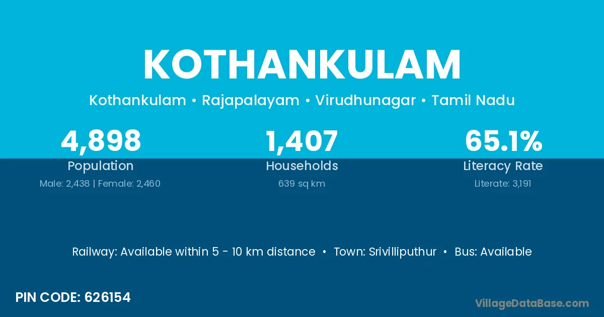 Kothankulam village has a total population of 4,898 people, of which 2,438 are males and 2,460 are females.