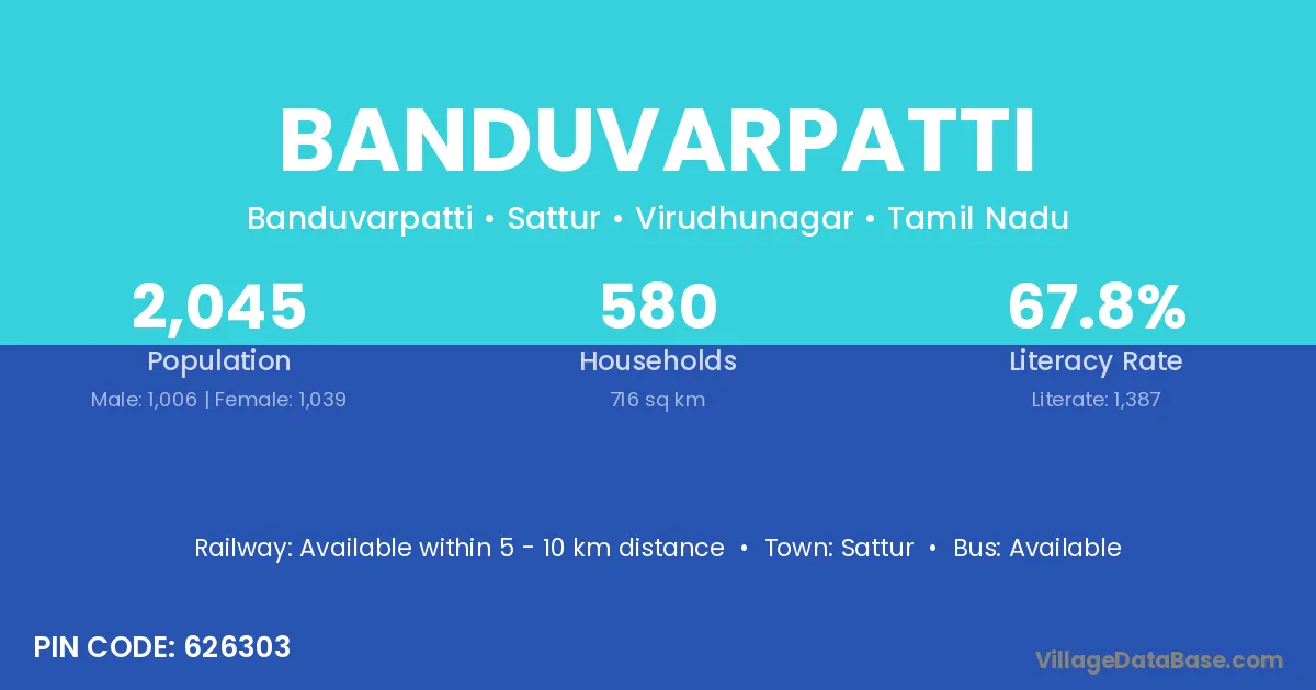 Banduvarpatti village has a total population of 2,045 people, of which 1,006 are males and 1,039 are females.