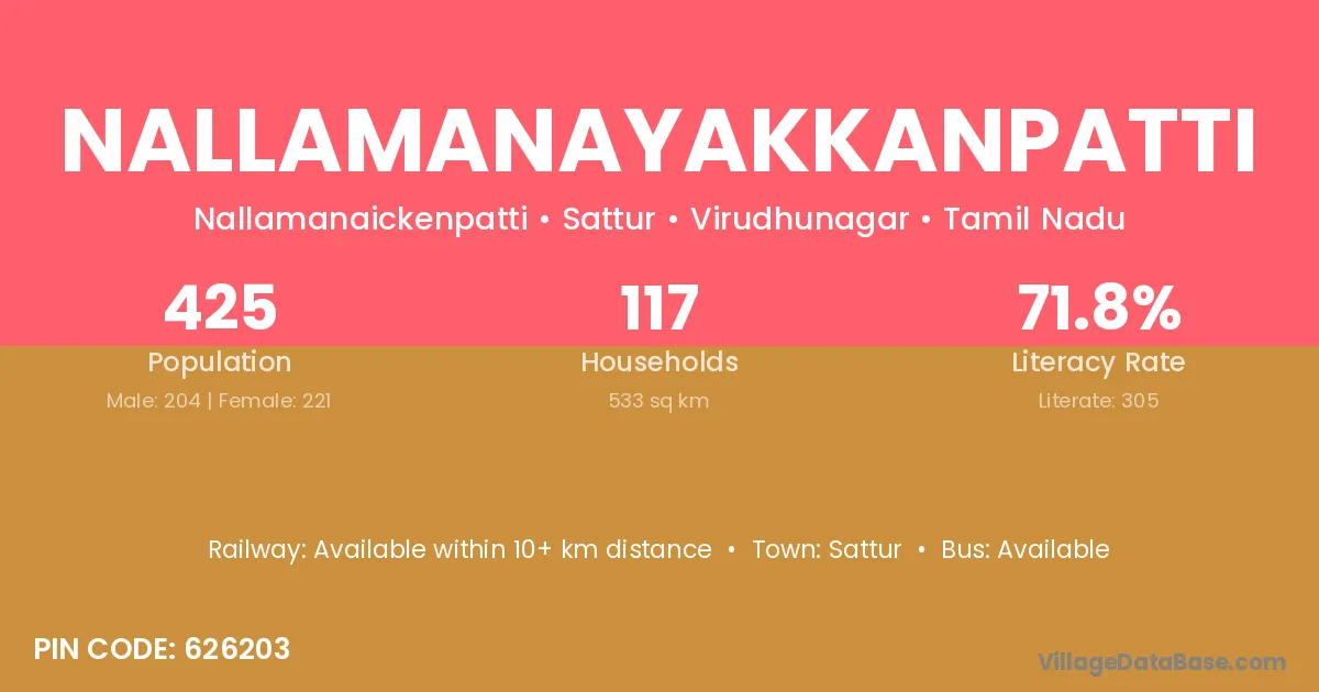 Nallamanayakkanpatti village has a total population of 425 people, of which 204 are males and 221 are females.