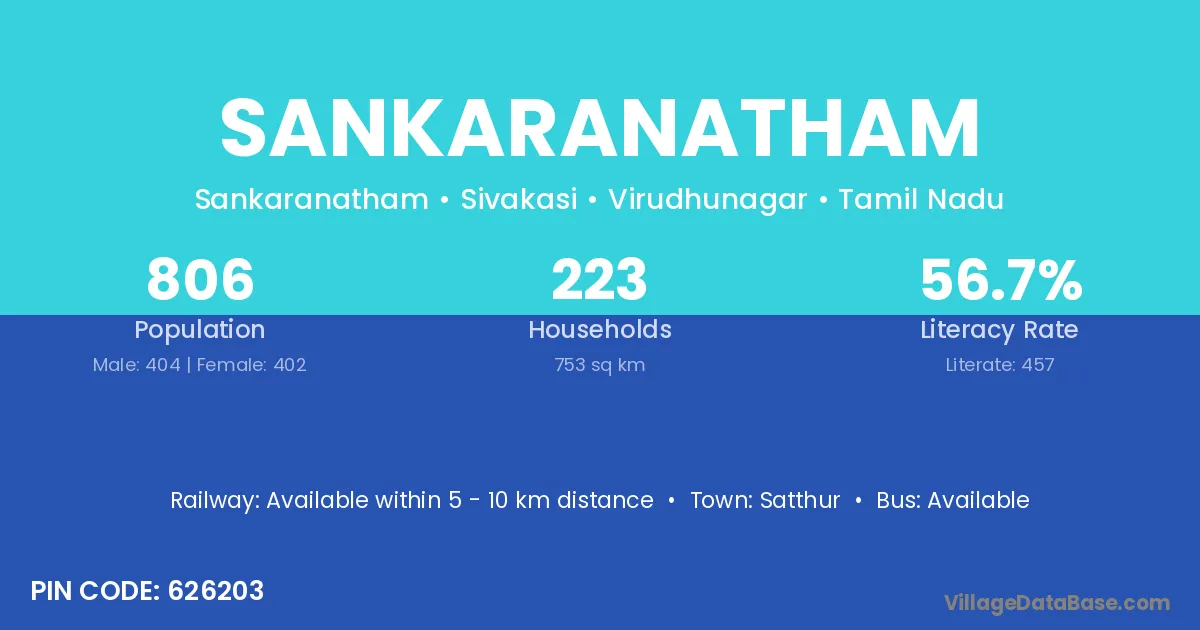 Sankaranatham village has a total population of 806 people, of which 404 are males and 402 are females.