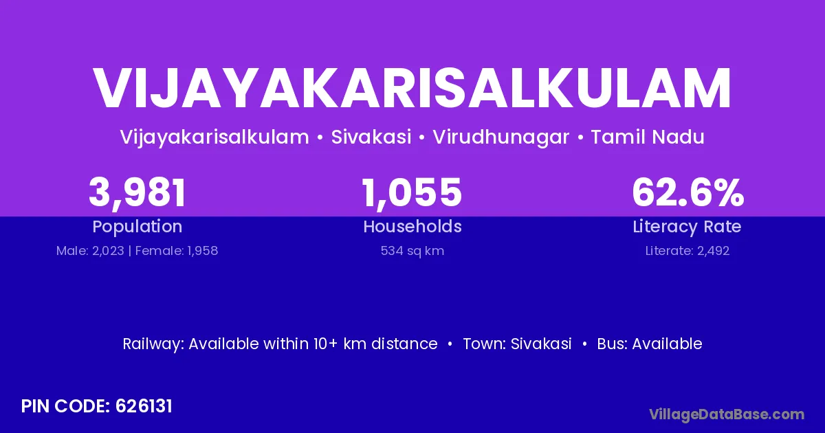 Vijayakarisalkulam village has a total population of 3,981 people, of which 2,023 are males and 1,958 are females.