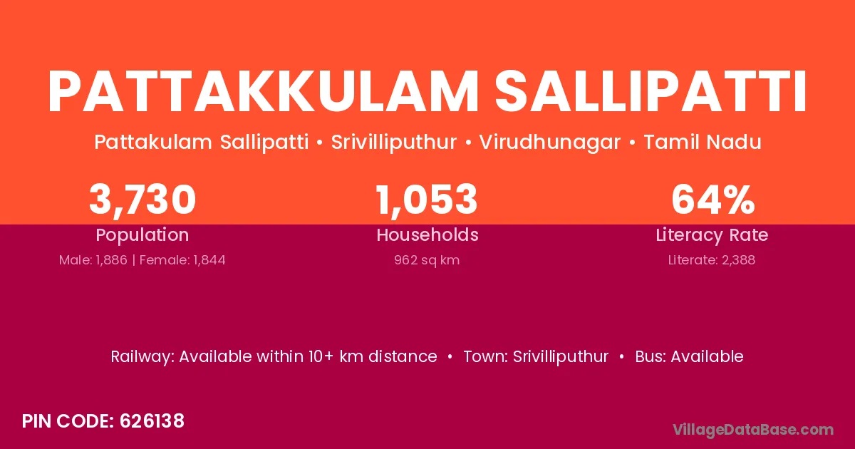 Pattakkulam Sallipatti village has a total population of 3,730 people, of which 1,886 are males and 1,844 are females.