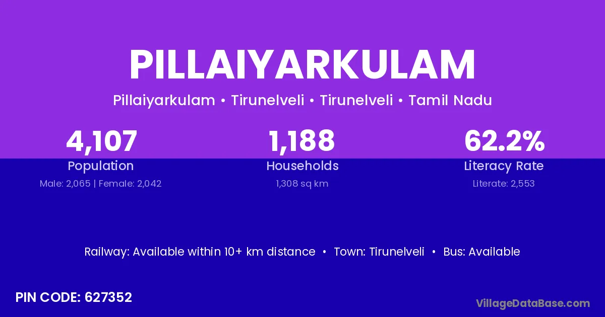 Pillaiyarkulam village has a total population of 6,271 people, of which 3,119 are males and 3,152 are females.