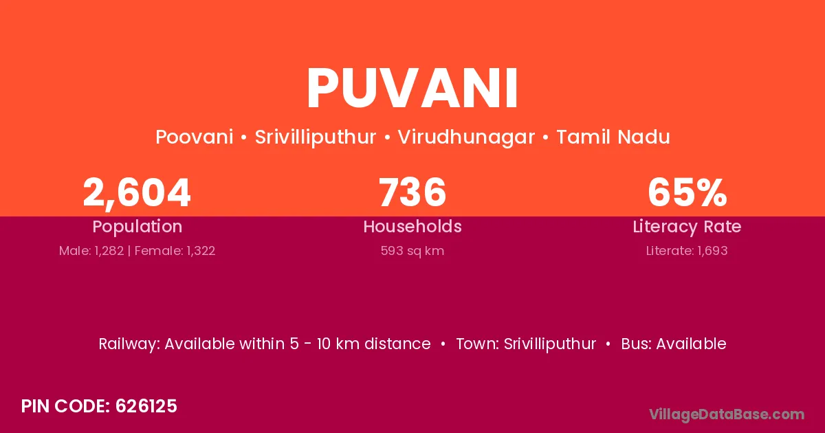 Srivilliputhur is the nearest town to Puvani village for major economic activities