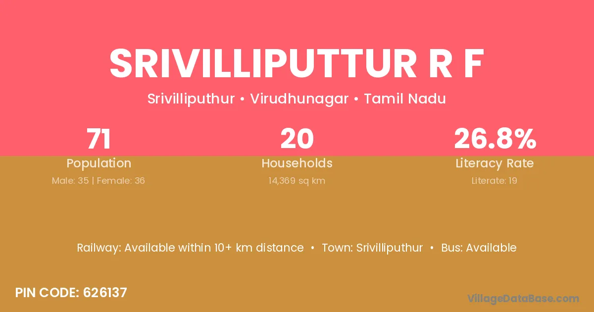 Srivilliputtur R F village has a total population of 71 people, of which 35 are males and 36 are females.