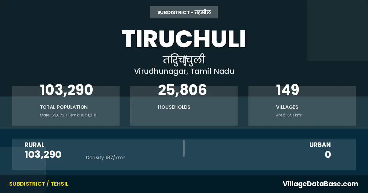 According to the 2011 census The total area of Tiruchuli Taluka is 551 km², with a population of 103290 people. The population density is 187 inhabitants per square kilometre, and there are approximately 25806 houses in the sub district.