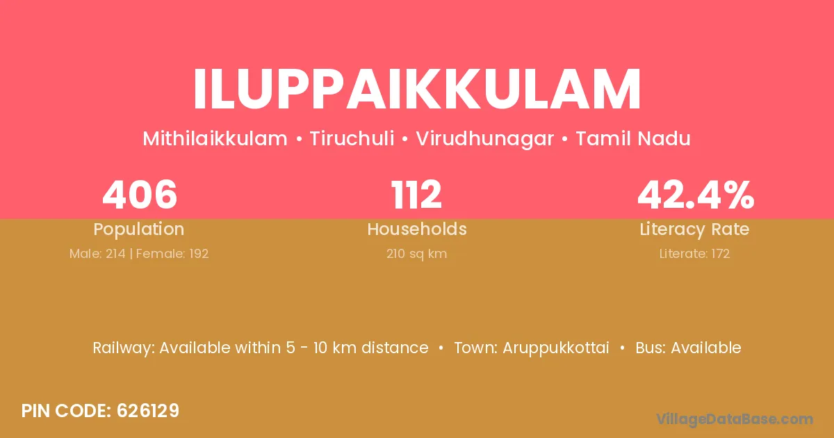 Iluppaikkulam village has a total population of 406 people, of which 214 are males and 192 are females.