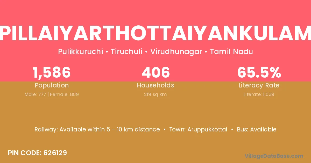 There are approximately 406 households in Pillaiyarthottaiyankulam village.