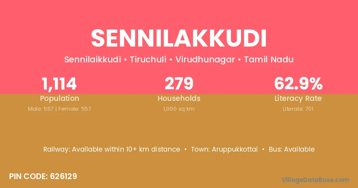 Sennilakkudi village has a total population of 1,114 people, of which 557 are males and 557 are females.