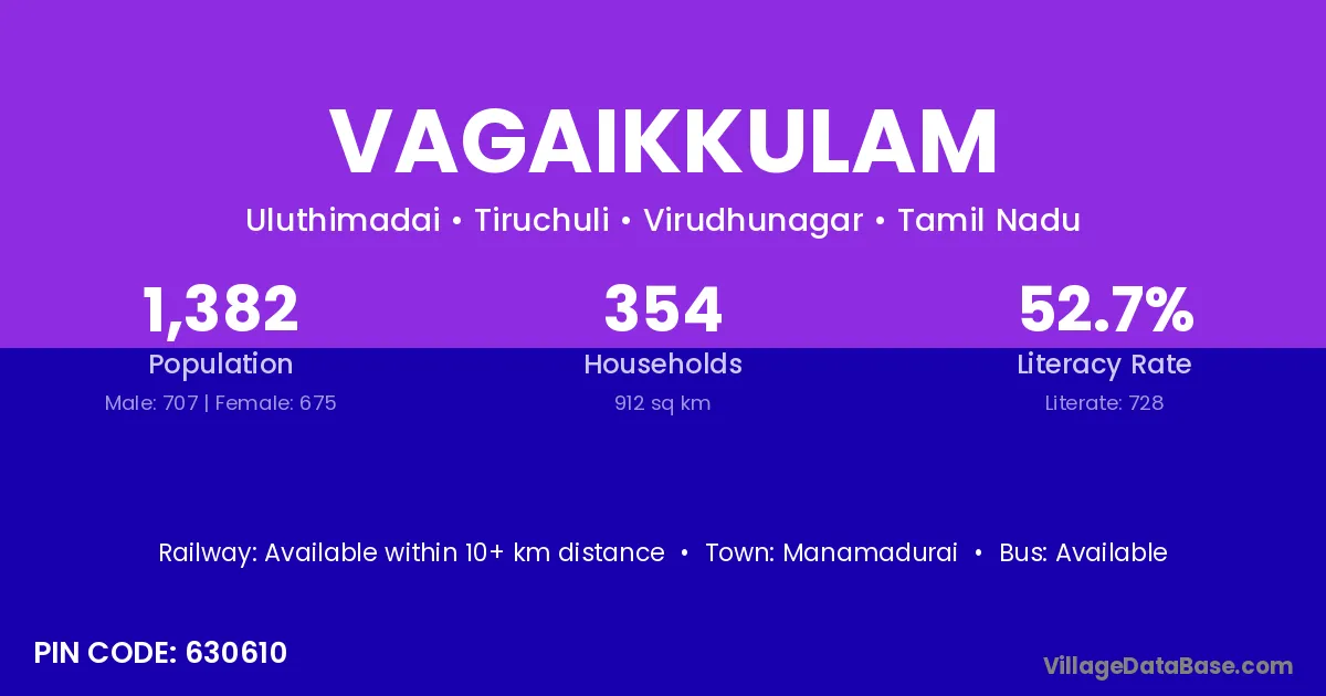 Vagaikkulam village has a total population of 1,382 people, of which 707 are males and 675 are females.