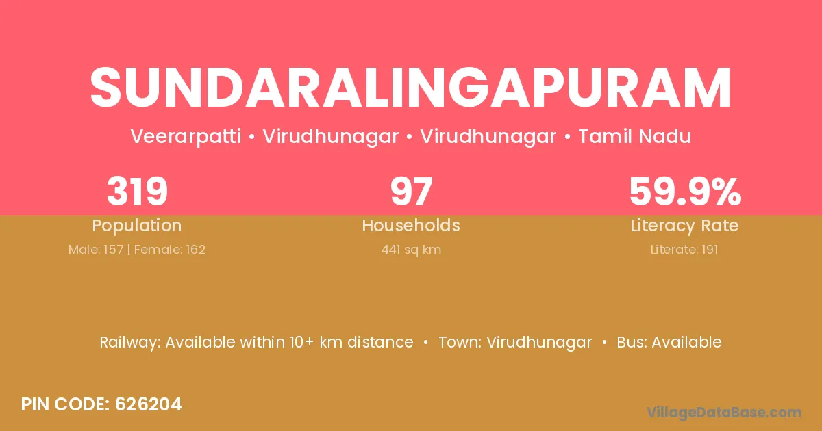 Sundaralingapuram village has a total population of 319 people, of which 157 are males and 162 are females.