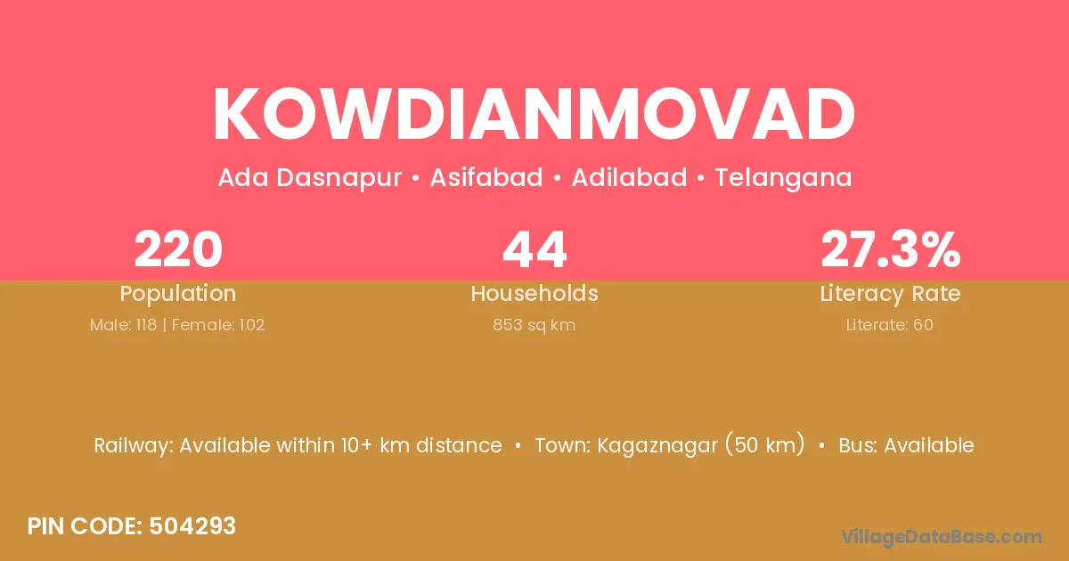 Kagaznagar (50 km) is the nearest town to Kowdianmovad village for major economic activities and is located approximately 50 km away.