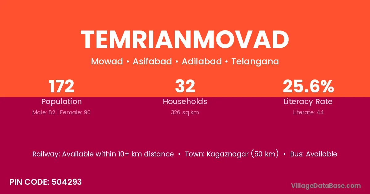 Kagaznagar (50 km) is the nearest town to Temrianmovad village for major economic activities and is located approximately 50 km away.